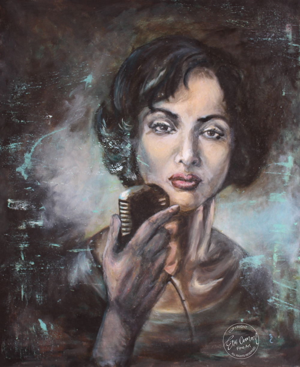 Captured in a moment of soulful expression, this vintage-inspired painting brings to life a timeless female jazz singer. With a rich color palette and soft, fluid brushstrokes, the piece exudes the elegance and emotion of a bygone era. Her depiction is full of energy, as if her voice is about to fill the air with the melody she sings, that resonate deep within the heart. The vintage aesthetic, with its subtle nods to the golden age of jazz, transports the viewer to smoky clubs and dimly lit stages, where the power of music and the allure of the performer take center stage.